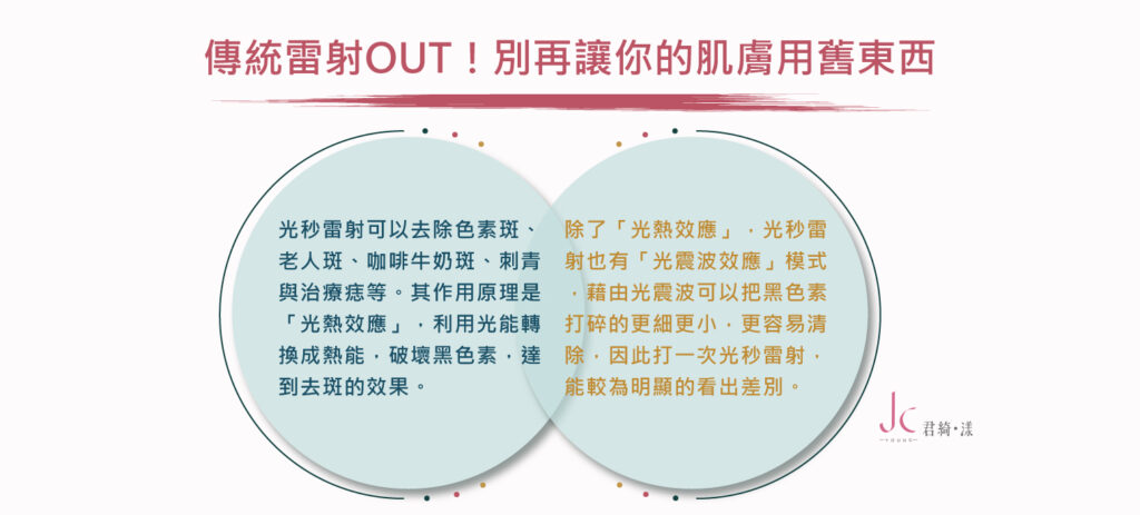 雷射能量穿透肌膚,作用於色素細胞或組織纖維,產生光熱或光震效應。