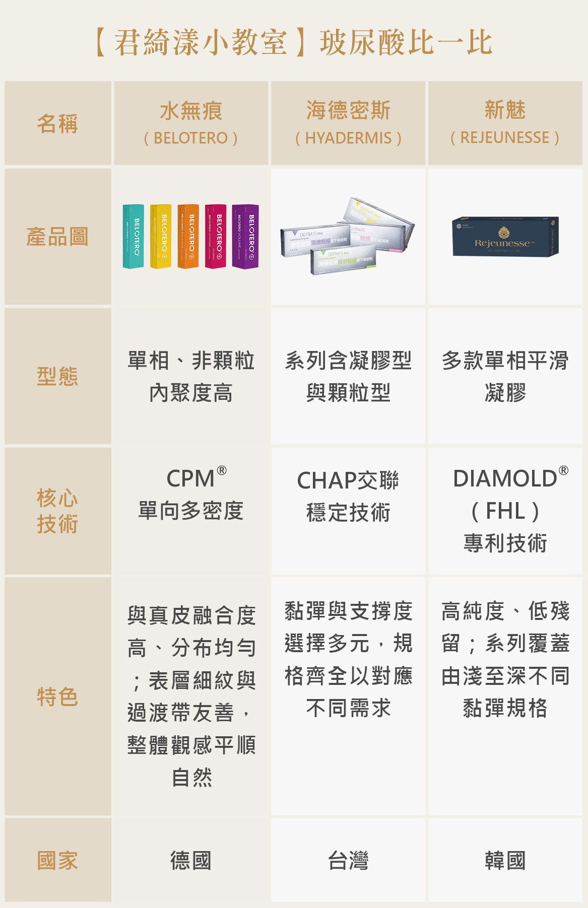 - 來自德國Merz藥廠的Belotero®保柔緹,又稱「水無痕玻尿酸」,具歐盟CE與美國FDA安全認證,並於多國臨床使用。以自然、平順為訴求,適合在意近看質感與細節的人。